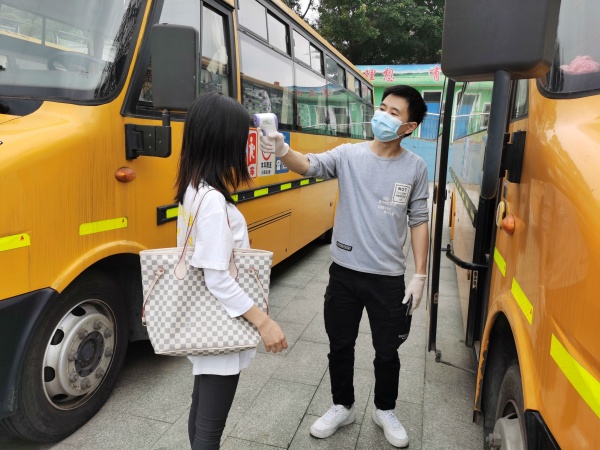 第四個場景是乘坐校車。校車到點(diǎn),教師下車,先對學(xué)生測體溫,測溫正常后上車。如果體溫異常,跟車?yán)蠋燅R上跟家長聯(lián)系,要求接回孩子,赴醫(yī)院就診,老師陪伴等待家長到來,然后老師向主管行政報告,再由主管行政繼續(xù)跟進(jìn)。