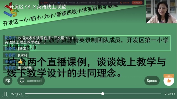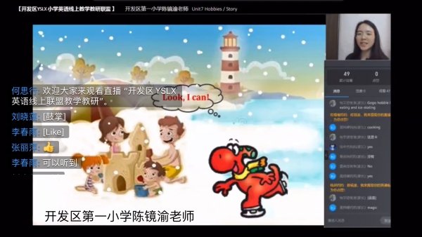 此次四校聯(lián)盟研討中,除了四校的英語教師、英語科組長和區(qū)英語中心教研組組長參加外,還邀請了開發(fā)區(qū)第一小學(xué)蔡長青副校長、開發(fā)區(qū)第一小學(xué)李春雨副主任及其他兄弟學(xué)校的部分英語教師一同參加了研討。活動(dòng)首先通過線上同課異構(gòu)的教學(xué)形式,分享了聯(lián)盟學(xué)校過去兩個(gè)月英語線上教學(xué)的情況;主要由開發(fā)區(qū)第一小學(xué)陳鏡渝老師和第四小學(xué)孫意云老師進(jìn)行線上直播教學(xué),她們以不同的教學(xué)形式展示了四年級(jí)下冊“Unit7 Hobbies(Story)”的教學(xué)。她們在授課過程中,利用釘釘平臺(tái)的連麥、語音、互動(dòng)面板等功能,營造活躍互動(dòng)的課堂氛圍。