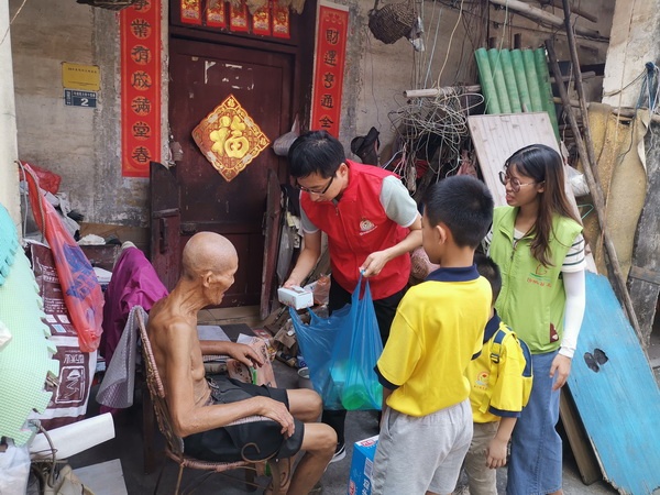 制作好月餅后,校親子義工家庭分成三組,去探望張家邊、海濱、聯(lián)富三個(gè)社區(qū)的十幾戶孤寡老人。在社區(qū)社工的帶領(lǐng)下,香暉園小學(xué)親子義工家庭的老師、家長(zhǎng)和孩子們帶著剛剛做好的月餅和一些生活用品看望了孤寡老人,為老人們送去了節(jié)日的溫暖和祝福。
