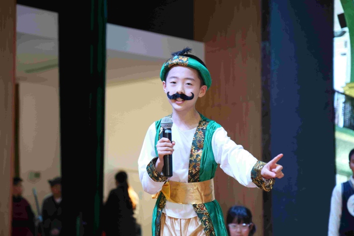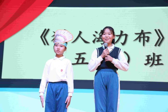 五年級民間故事展演,孩子們在舞臺上詮釋了中國古代民間故事的魅力?!冻料憔饶浮纷屓藙尤荩弧敦傌垞Q太子》《牛郎織女》《獵人海力布》《阿凡提的故事》《西門豹治鄴》扣人心弦……