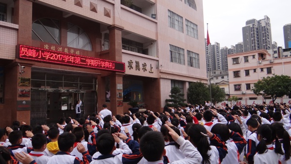 首先,舉行了升旗儀式。隨著雄壯的國(guó)旗聲在操場(chǎng)上響起,伴隨同學(xué)們嘹亮的歌聲,鮮艷的紅旗飄揚(yáng)在員峰小學(xué)校園的上空。新學(xué)期開(kāi)始了。