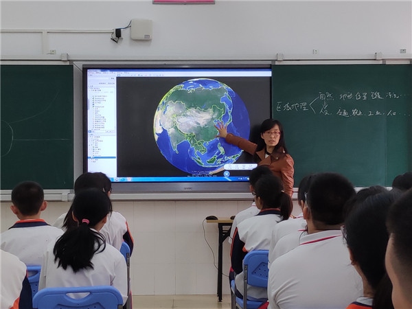 說(shuō)課活動(dòng)之后,北區(qū)中學(xué)勾青梅老師在智慧課室給初二學(xué)生上了一節(jié)《中國(guó)的區(qū)域差異——人文差異》的公開(kāi)示范課。勾青梅老師作為市級(jí)地理課題《Google earth在初中地理教學(xué)中的應(yīng)用》的成員,在示范課例中大量應(yīng)用Google earth 軟件,繪制多邊形展示了四大區(qū)域輪廓,發(fā)揮了Google earth的地理模型功能,利用縮小和放大功能展示了青藏地區(qū)的河谷農(nóng)業(yè),大大激起了學(xué)生的學(xué)習(xí)興趣,利用Google earth的地形圖展示功能,為學(xué)生展示了立體的地圖,利于學(xué)生的立體思維學(xué)習(xí)與發(fā)展,并在最后利用Google earth瀏覽功能展示了世界六大灣區(qū)在地球上的位置與形象,起到了非常好的教學(xué)效果,受到聽(tīng)課老師的一致好評(píng)。整節(jié)課,重難點(diǎn)突出,應(yīng)用了大量的智慧課堂技術(shù),將地理學(xué)習(xí)上升到一個(gè)新的高度。