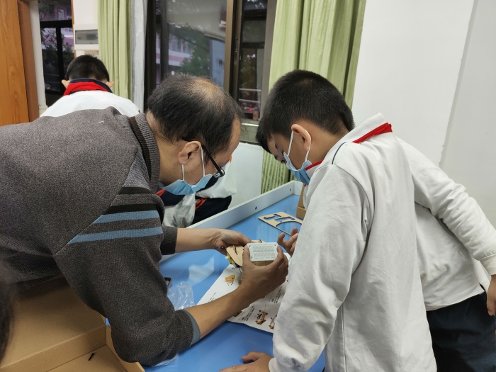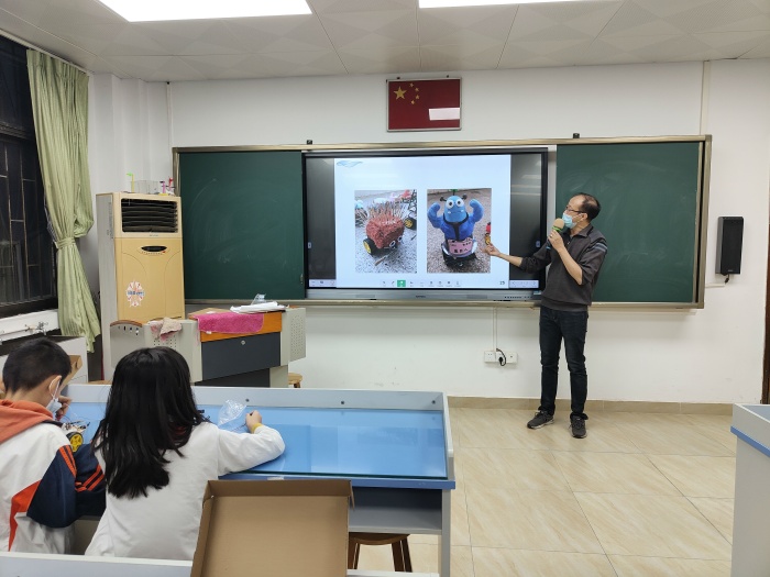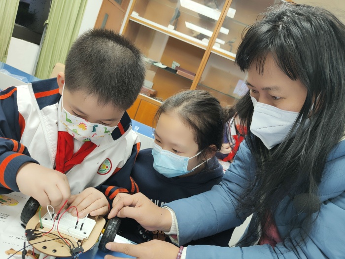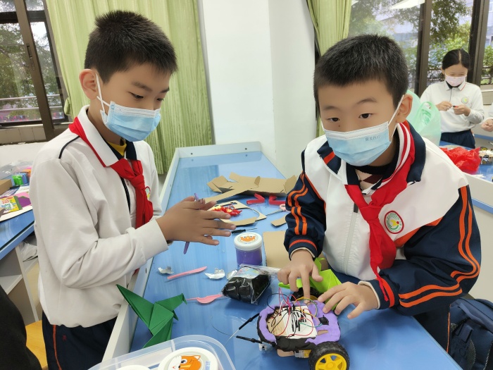 針對(duì)同學(xué)們出現(xiàn)的問(wèn)題,吳嘉亮和陳彩鳳兩位老師地耐心指導(dǎo),讓同學(xué)們?cè)谝淮未问≈姓业浇鉀Q的方法:檢查電池盒的電池正負(fù)極是否裝反了;是否可以對(duì)調(diào)一下馬達(dá)的黃線和綠線……同學(xué)們終于克服重重困難,把鼴鼠機(jī)器人拼裝成功。最后,同學(xué)們根據(jù)自己的喜好分工合作,把鼴鼠機(jī)器人裝扮得十分有特色。