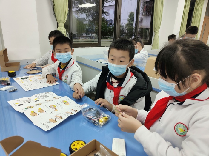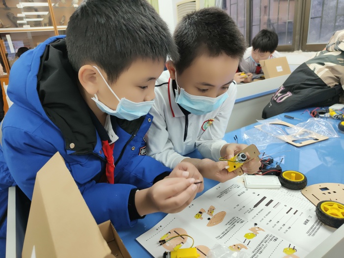 而臺(tái)下的同學(xué)們個(gè)個(gè)都非常認(rèn)真地聆聽(tīng),還不忘記下筆記。隨后,同學(xué)們根據(jù)老師希沃白板圖片的展示、模型展示及拼裝流程圖對(duì)機(jī)器人進(jìn)行了認(rèn)真的拼裝。剛開(kāi)始,由于不太了解,手忙腳亂的同學(xué)出現(xiàn)了許多問(wèn)題:裝面包板的四支腳裝反了,電池的位置裝得太邊,導(dǎo)致馬達(dá)裝不下了,又或者總開(kāi)關(guān)接通了但無(wú)動(dòng)作,兩點(diǎn)馬達(dá)轉(zhuǎn)動(dòng)的方向相反……