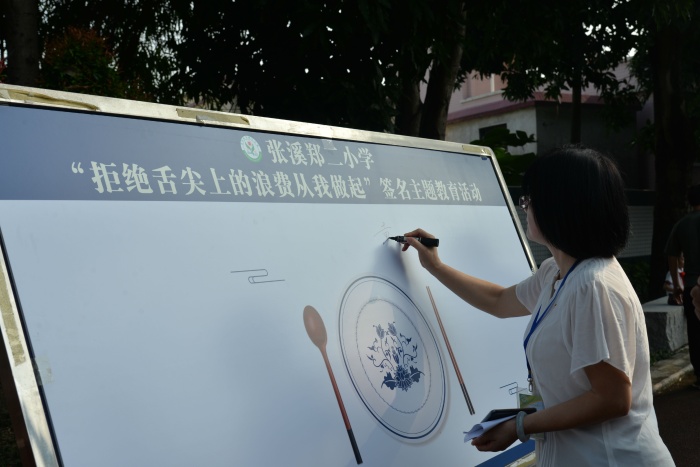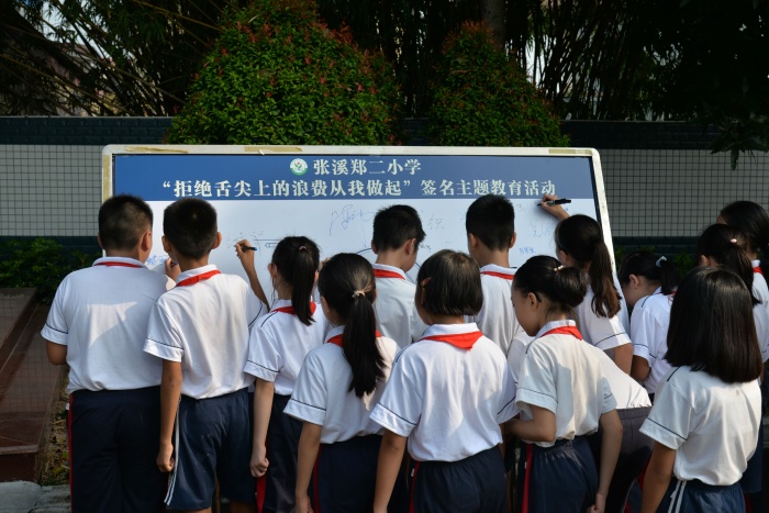 為積極響應黨中央的號召,拒絕舌尖上的浪費,傳承舌尖上的美德,學校德育處王太能主任帶領全體學生宣誓,宣誓結束后,戴織校長帶領教師代表和學生代表在“拒絕舌尖上的浪費從我做起”宣傳板上簽名,張溪學子爭做“光盤行動”的踐行者,爭做節(jié)約糧食的倡導者、行動者。