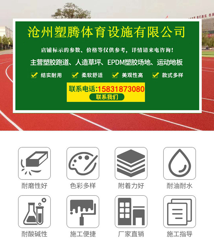 ??我公司擁有先進(jìn)的工藝技術(shù)和機(jī)械加工設(shè)備。專業(yè)生產(chǎn)各種規(guī)格的人工草坪、EPDM彩色橡膠顆粒、膠水等。廣泛應(yīng)用于塑膠跑道、籃球場、足球場、網(wǎng)球場、游泳池、體育場館運(yùn)動地面、幼兒園防滑地面等。該產(chǎn)品具有綠色環(huán)保、色澤穩(wěn)定且抗紫外線、耐磨損、彈性好,使用壽命長,易鋪設(shè)保養(yǎng)等優(yōu)點(diǎn)。產(chǎn)品經(jīng)上海和深圳檢測中心檢測,各項(xiàng)技術(shù)指標(biāo)全部合格,達(dá)到行業(yè)標(biāo)準(zhǔn)。 我們本著以質(zhì)量求生存,以周到的服務(wù)求發(fā)展,熱忱歡迎海內(nèi)外廣大客戶和我們合作,攜手共創(chuàng)輝煌!