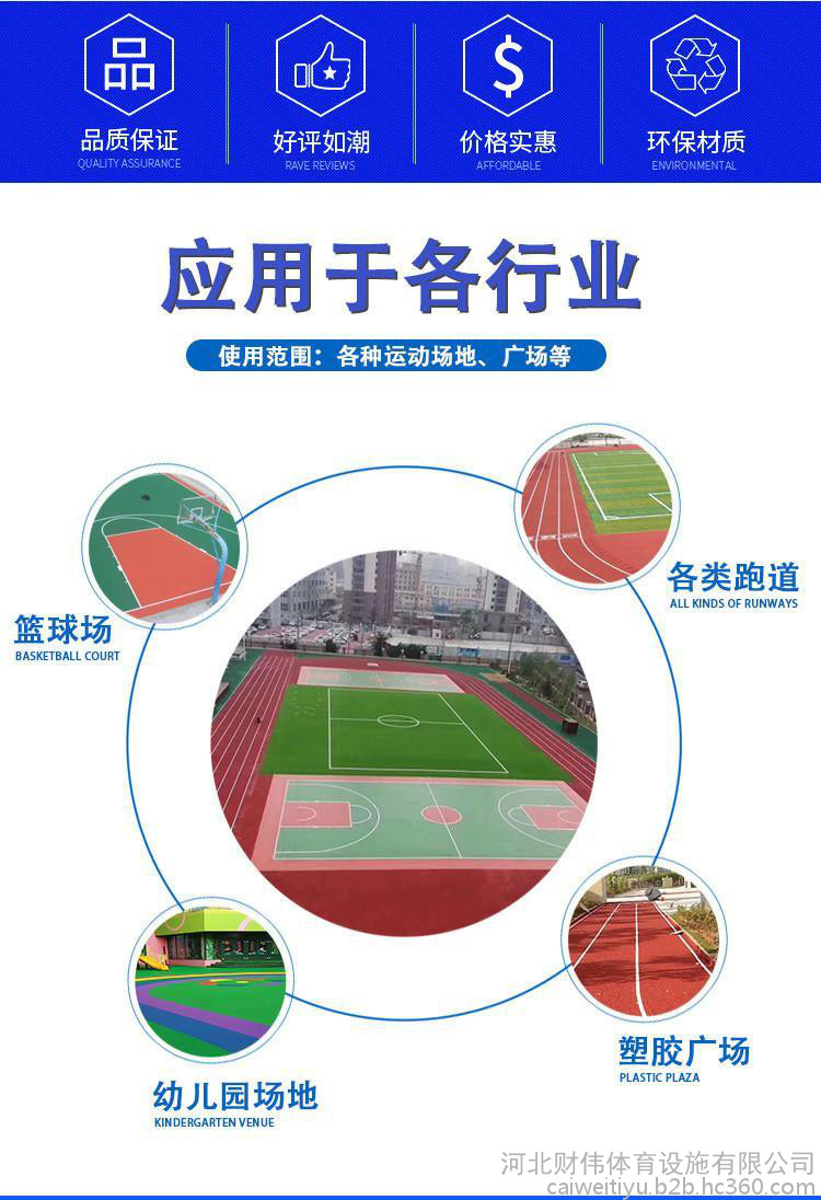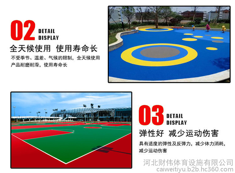 ??安穩(wěn)性:混合型塑膠跑道具有優(yōu)異的抗老化及耐鹽霧、濕熱、臭氧、紫外線功用,內(nèi)涵物理機(jī)械性能及外觀結(jié)構(gòu)特征恒久不變,延伸其 運(yùn)用壽命。實(shí)用性:塑膠跑道是全天候跑道,在具有恰當(dāng)排水系統(tǒng)時(shí),大雨后或沖刷后也能當(dāng)即用于練習(xí)、比賽和游戲,且其運(yùn)用性能不變。