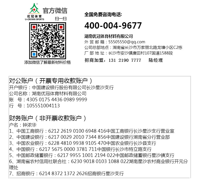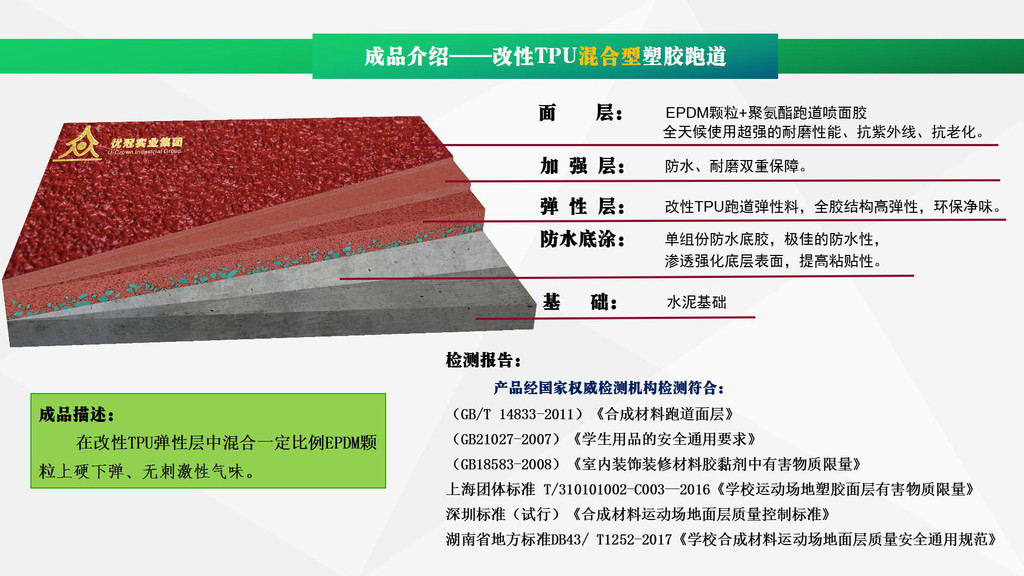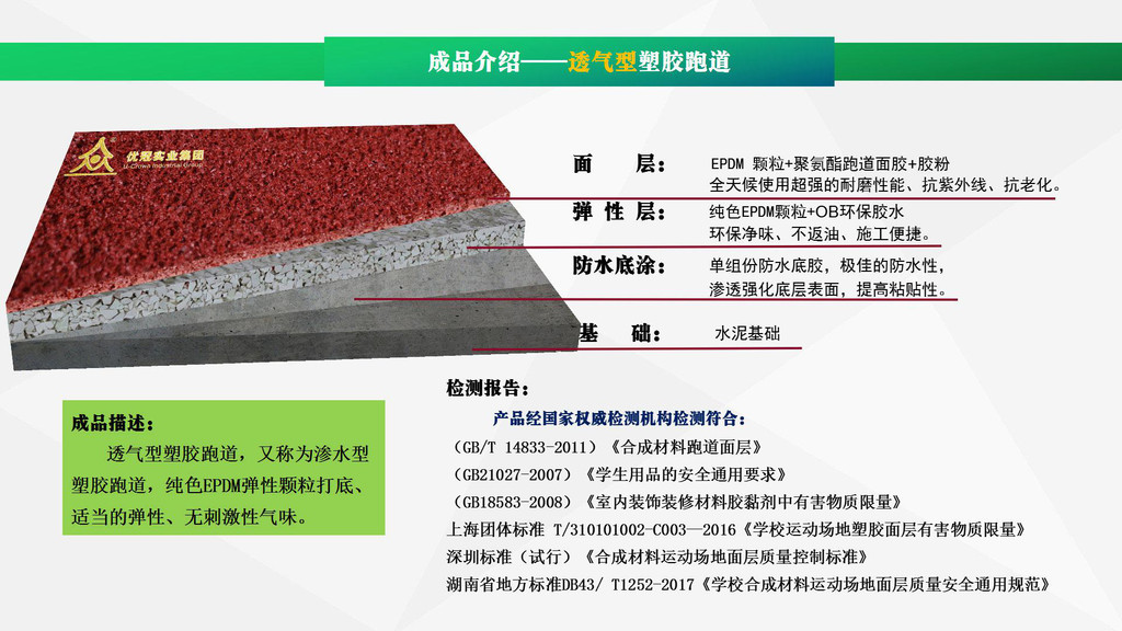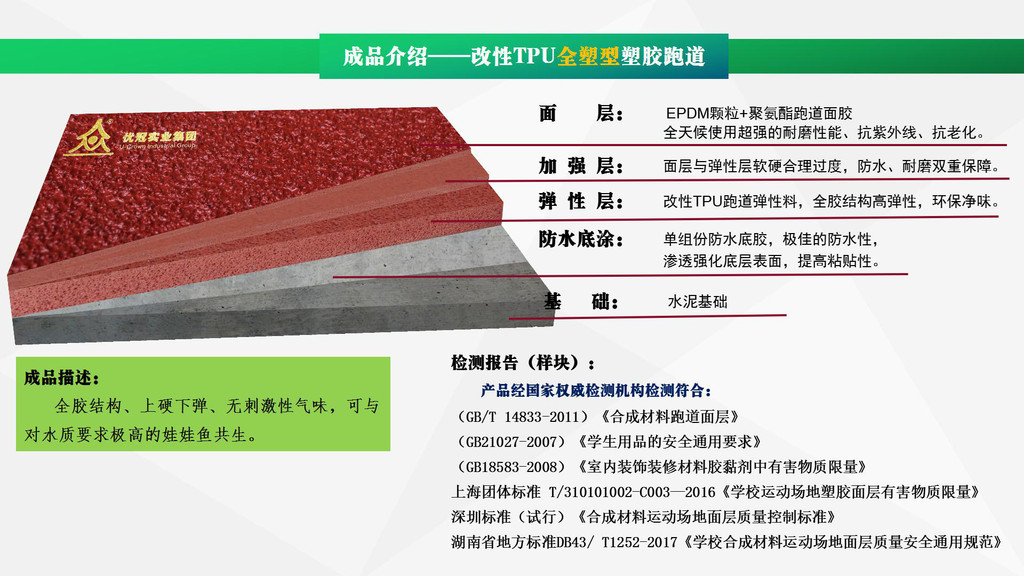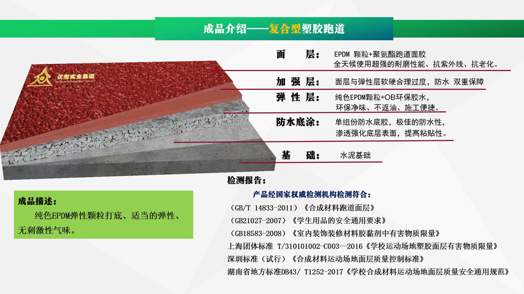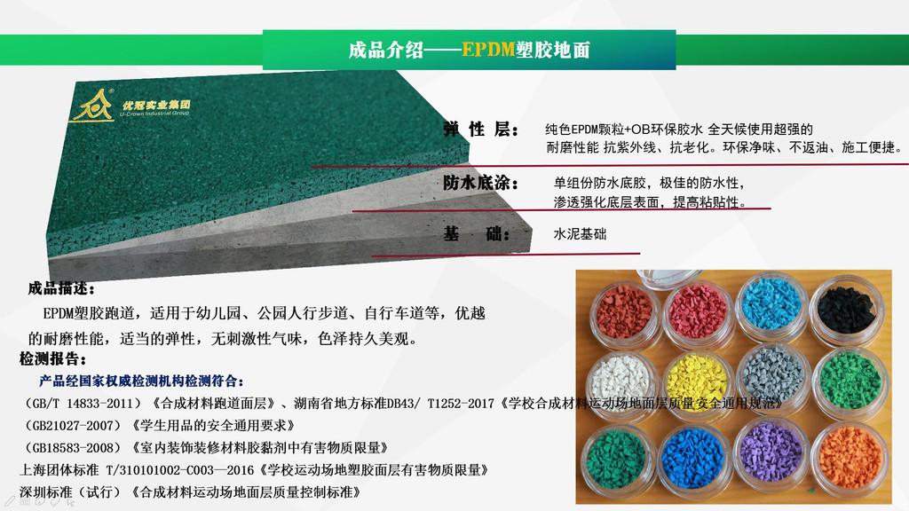 優(yōu)冠實(shí)業(yè)集團(tuán)有限公司(以下簡(jiǎn)稱集團(tuán))是一家專業(yè)從事運(yùn)動(dòng)場(chǎng)地材料,人造草坪研發(fā)、生產(chǎn)、銷售、鋪裝的科技創(chuàng)新型企業(yè),是湖南省地方標(biāo)準(zhǔn)DB43/ T1252-2017《學(xué)校合成材料運(yùn)動(dòng)場(chǎng)地面層質(zhì)量安全通用規(guī)范》主要起草單位之一。公司具備國(guó)際田聯(lián)(IAAF)認(rèn)證、國(guó)際網(wǎng)聯(lián)(ITF)認(rèn)證、中國(guó)環(huán)境標(biāo)志產(chǎn)品認(rèn)證、中國(guó)綠色材料標(biāo)志授權(quán)使用證書、企業(yè)生產(chǎn)環(huán)評(píng)批復(fù)報(bào)告、安全生產(chǎn)標(biāo)準(zhǔn)化三級(jí)企業(yè)證書、對(duì)外貿(mào)易經(jīng)營(yíng)者備案登記表等,并成為湖南省政府采購(gòu)協(xié)會(huì)會(huì)員。集團(tuán)下轄湖南優(yōu)冠體育材料有限公司、五舟體育設(shè)備制造有限公司、湖南康普斯人造草坪有限公司、湖南科迪環(huán)??萍加邢薰?、湖南優(yōu)冠運(yùn)動(dòng)場(chǎng)鋪裝技術(shù)服務(wù)有限公司、湖南優(yōu)冠塑膠體育工程有限公司。