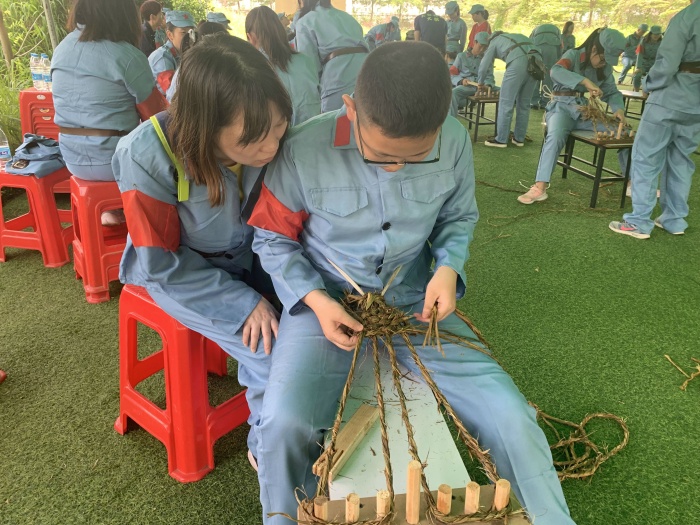 達(dá)到指定地點(diǎn)后,學(xué)生和家長(zhǎng)們迅速換好軍裝,整理好隊(duì)形,斗志昂揚(yáng)地參加研學(xué)的第一項(xiàng)活動(dòng)“重走長(zhǎng)征路”。此項(xiàng)活動(dòng),由學(xué)生和家長(zhǎng)合力組成4路縱隊(duì),“重走長(zhǎng)征路”,體驗(yàn)長(zhǎng)征途中紅軍運(yùn)送物資的艱辛。緊接著,以家庭為單位開(kāi)展“編草鞋”的有趣活動(dòng)。通過(guò)兩項(xiàng)活動(dòng),大家意識(shí)到紅軍在物質(zhì)資源極度匱乏的情況下長(zhǎng)征的艱辛和困苦。
