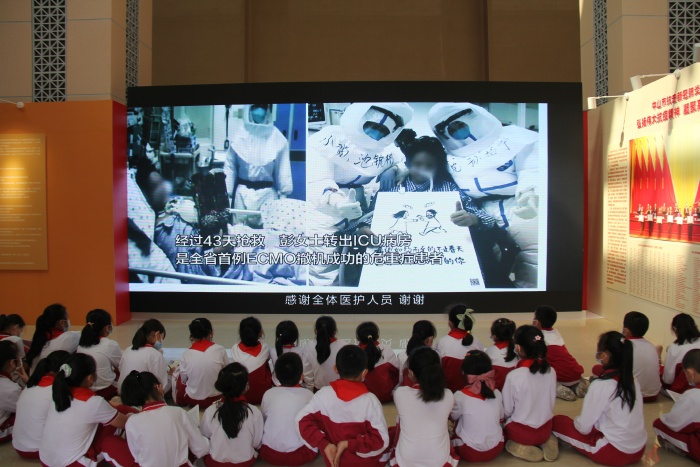 中山抗疫展分為“中山速度”“中山力量”“中山溫度”“中山情懷”“中山擔(dān)當(dāng)”五個(gè)篇章,融合大量圖文、音視頻、實(shí)物、抗疫主題文藝作品等資料,運(yùn)用聲光電、VR/AR技術(shù),全面、立體、生動(dòng)還原了中山抗疫情景,記錄令人蕩氣回腸的中山“抗疫長(zhǎng)卷”。通過(guò)此次觀展活動(dòng),開(kāi)發(fā)區(qū)第一小學(xué)的40余名學(xué)生代表透過(guò)展覽,一起感同身受那份英雄的事跡,學(xué)生認(rèn)真參觀學(xué)習(xí),被抗疫英雄的事跡深深感動(dòng),講解員在采訪個(gè)別同學(xué)時(shí),有的孩子說(shuō):“我們要學(xué)習(xí)醫(yī)生和護(hù)士們的獻(xiàn)身精神”,也有的說(shuō):“我們要好好學(xué)習(xí),長(zhǎng)大后要保家衛(wèi)國(guó)”?;顒?dòng)最后學(xué)生通過(guò)體驗(yàn)VR影像技術(shù),從病人和醫(yī)生兩個(gè)視角真切感受隔離病房實(shí)景,向奮斗的疫情前的醫(yī)護(hù)工作者點(diǎn)贊,學(xué)以明志、行以大愛(ài),相信開(kāi)發(fā)區(qū)第一小學(xué)的學(xué)子在未來(lái)的人生路上永不退縮,知難而上,做時(shí)代好少年。
