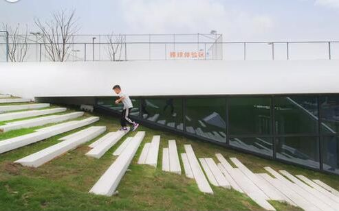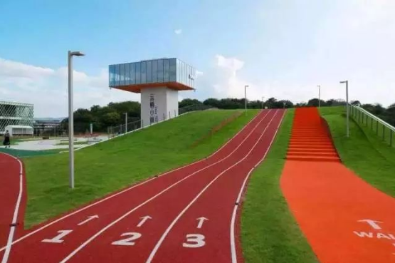 云棲小鎮(zhèn)會展中心二期是一個(gè)非典型的“會展中心”,因?yàn)樗仁且粋€(gè)功能齊備的會展中心,閑時(shí)它又會變身成為一個(gè)“體育倉庫”,里頭有籃球、羽毛球、攀巖等各種場地,但最搶眼的則是會展中心屋頂上,橫亙著的那條760米長的環(huán)形塑膠跑道。這整條跑道和以往見過的任何一條操場跑道不同,有上下坡,有彎曲和分叉,也有直行沖刺道,建筑邊沿處還特別設(shè)計(jì)了一段50米長完全懸空的“凌空跑道”。