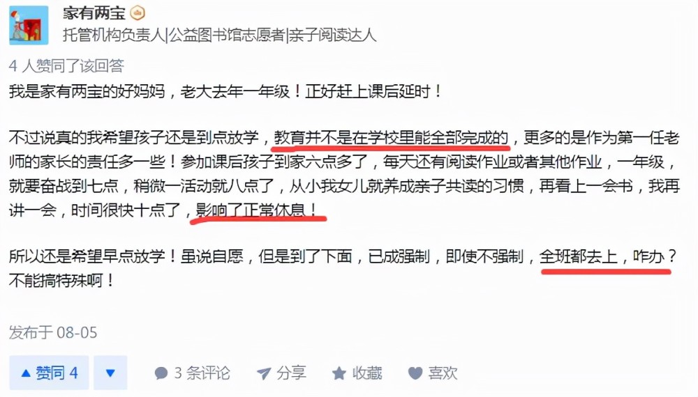 還是有不少小學(xué)生家長對此表示不滿,特別是一年級(jí)新生家長,直接拒絕報(bào)名課后延時(shí)。雖然教育部和學(xué)校已經(jīng)做出詳細(xì)部署,可還是有很多問題尚未得到解決。