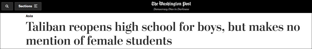 塔利班發(fā)言人比拉爾?卡里米(Bilal Karimi)告訴《華盛頓郵報》(The Washington Post),他不知道教育部有關(guān)為男孩重開學(xué)校的決定,但學(xué)校對女孩“關(guān)閉”。他補充道,“我們致力于男孩和女孩的教育,致力于有一個受過教育的一代”。