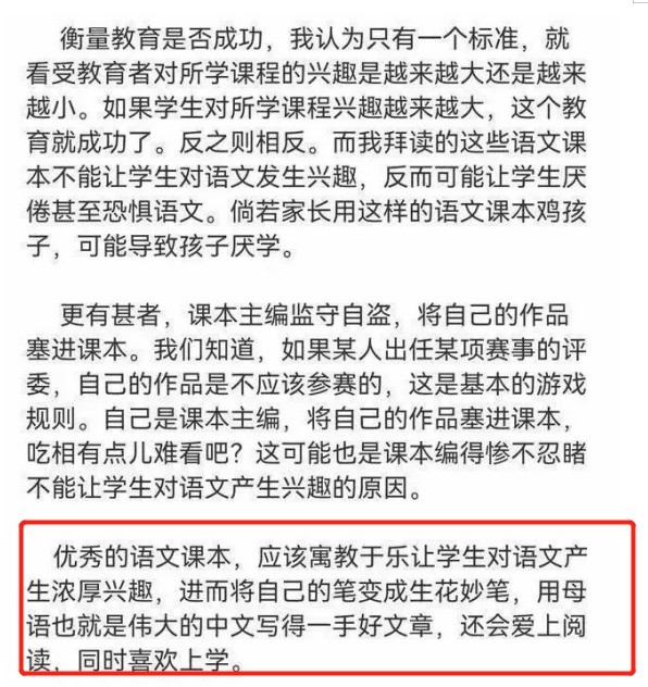 為了佐證語文教材選材上的問題,他還直言,課本主編利用職務之便將自己的文章塞進教材,有“監(jiān)守自盜”的嫌疑。此外,鄭淵潔認為,語文課本應該讓學生對學習產生濃厚的興趣,愛母語,愛上學,而不是產生厭惡的心理。