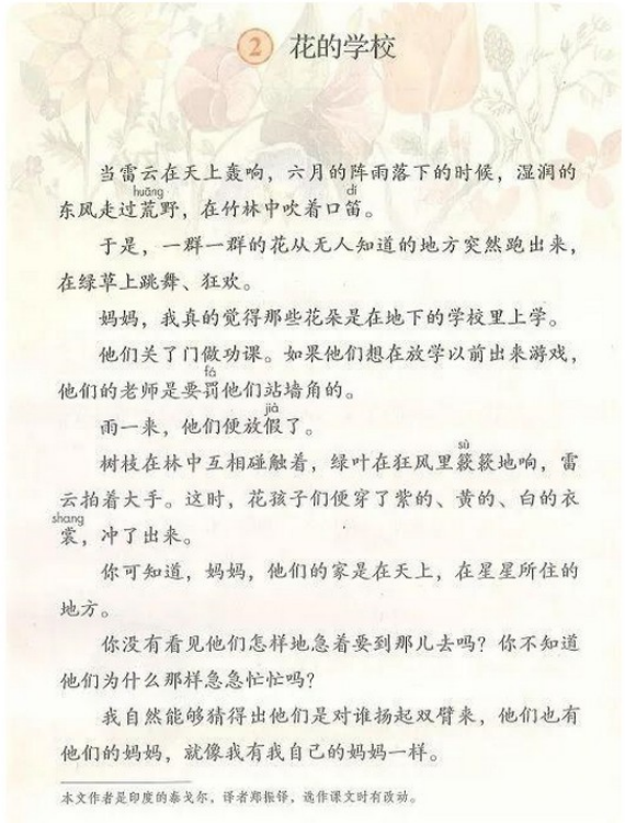 有家長指出,三年級上冊中摘錄了泰戈爾的作品《花的學校》,雖然泰戈爾在國際上的知名度很高,他的這篇選文想象力很是豐富,但是其主旨不明朗,在內容上的描述上也是天馬行空,讓人不知所云。