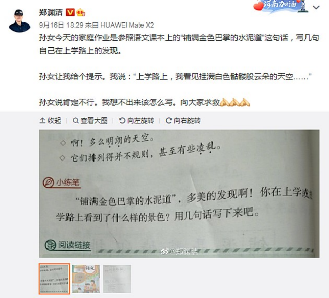 2021年9月中旬,鄭淵潔在個人賬號尋求幫助,他在輔導孫女寫作業(yè)的時候遇到了難題,希望網友們能幫他解答。他把語文書課后的圖片附在動態(tài)下方,通過這些圖片可以得知,難道他的題目內容是部編教材三年級上冊《鋪滿金色巴掌的水泥道》的語句仿寫。