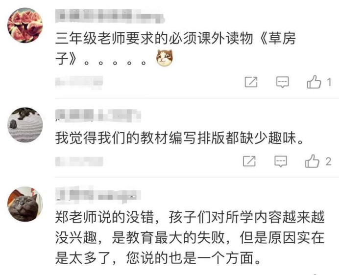 而在鄭淵潔質疑語文書的選材之后,評論區(qū)有不少家長紛紛響應。他們認為現在的語文書在選材上實在是莫名其妙,內容或者枯燥無味,或者深奧難懂,有些選文甚至有些莫名其妙,讓人不知所云。作為家長都看不懂選文的主旨,更不要說正在讀中小學的孩子們了。