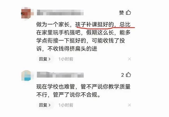 終于不用補(bǔ)課了,家長(zhǎng)也不用硬著頭皮給學(xué)生花費(fèi)高價(jià)補(bǔ)課,真正地做到了給學(xué)生減負(fù)。不過(guò),也有不少的家長(zhǎng)表示反對(duì),因?yàn)樯龑W(xué)的壓力還在,甚至升學(xué)的難度還在增加。