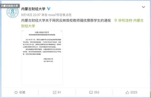 9月18日深夜,@內(nèi)蒙古財(cái)經(jīng)大學(xué) 發(fā)布通報(bào)稱,9月17日,網(wǎng)民在自媒體平臺(tái)反映我校教師騷擾猥褻學(xué)生信息。學(xué)校黨委高度重視,于當(dāng)晚19時(shí)召開黨委會(huì),決定成立專項(xiàng)工作小組,對(duì)網(wǎng)民反映事項(xiàng)迅速開展調(diào)查核實(shí);同時(shí)停止該教師的教學(xué)研究工作,并責(zé)令其配合學(xué)校開展調(diào)查。