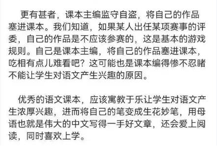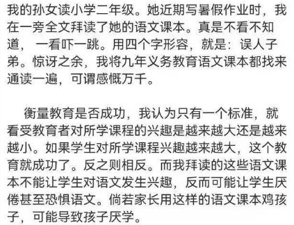 "衡量教育是否成功,我認(rèn)為只有一個(gè)標(biāo)準(zhǔn),就是受教育者對(duì)所學(xué)課程的興趣是越來(lái)越大還是越來(lái)越?。咳绻麑W(xué)生對(duì)所學(xué)的課程興趣越來(lái)越大,這個(gè)教育就成功了,反之則相反。而我拜讀的這些語(yǔ)文課本不但不能讓學(xué)生對(duì)語(yǔ)文發(fā)生興趣,反而可能會(huì)讓學(xué)生厭倦,甚至恐懼語(yǔ)文。”