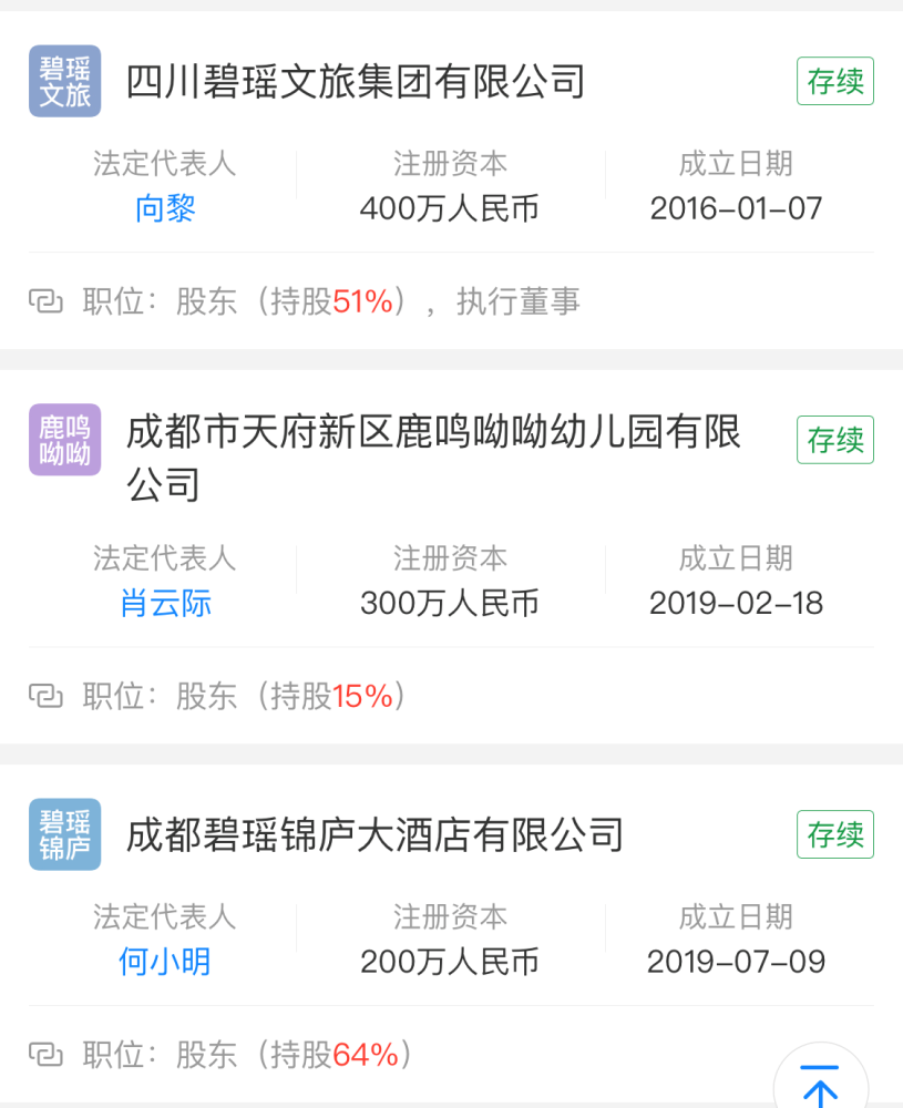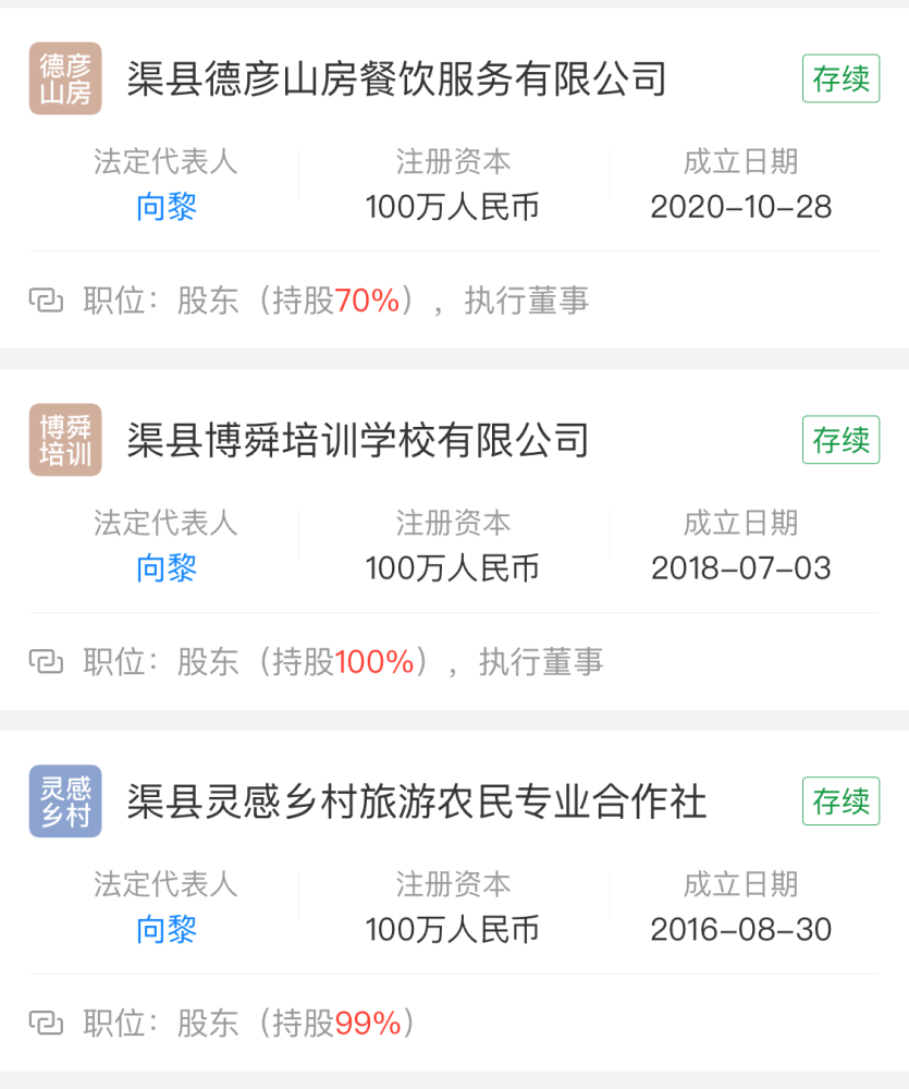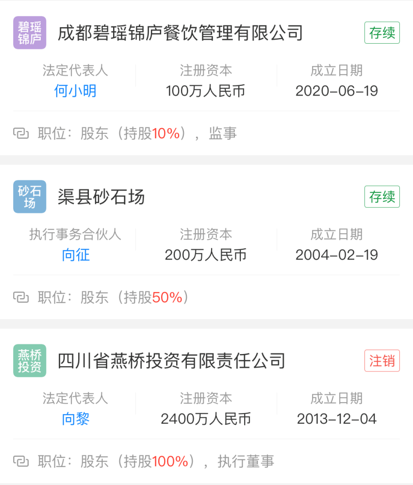 通過(guò)工商注冊(cè)信息可以查到,與校長(zhǎng)向黎相關(guān)的企業(yè)共有15家,其中仍在正常經(jīng)營(yíng)的有11家。11家企業(yè)中,既有渠縣砂石廠和博舜農(nóng)業(yè)發(fā)展有限公司,也有成都碧瑤錦廬餐飲、渠縣德彥山房餐飲、成都碧瑤錦廬大酒店三家餐飲實(shí)體。