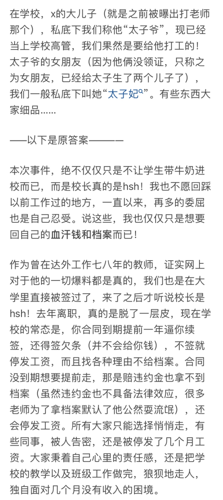 我來(lái)歸納一下這位網(wǎng)友總結(jié)出來(lái)的十宗罪:罪狀一,強(qiáng)迫師生到自己開(kāi)的風(fēng)景區(qū)搞活動(dòng)和消費(fèi);罪狀二,不允許學(xué)生轉(zhuǎn)出學(xué)籍;罪狀三,學(xué)校職責(zé)分工太混亂;罪狀四,每月征收各種費(fèi)用;罪狀五,少繳社保、晚交公積金、福利過(guò)低;罪狀六,工資拖期發(fā)放;罪狀七,利用食堂和超市賺師生的錢(qián);罪狀八,老師住宿條件差;罪狀九,文山會(huì)海;罪狀十,以各種理由阻止老師離職。