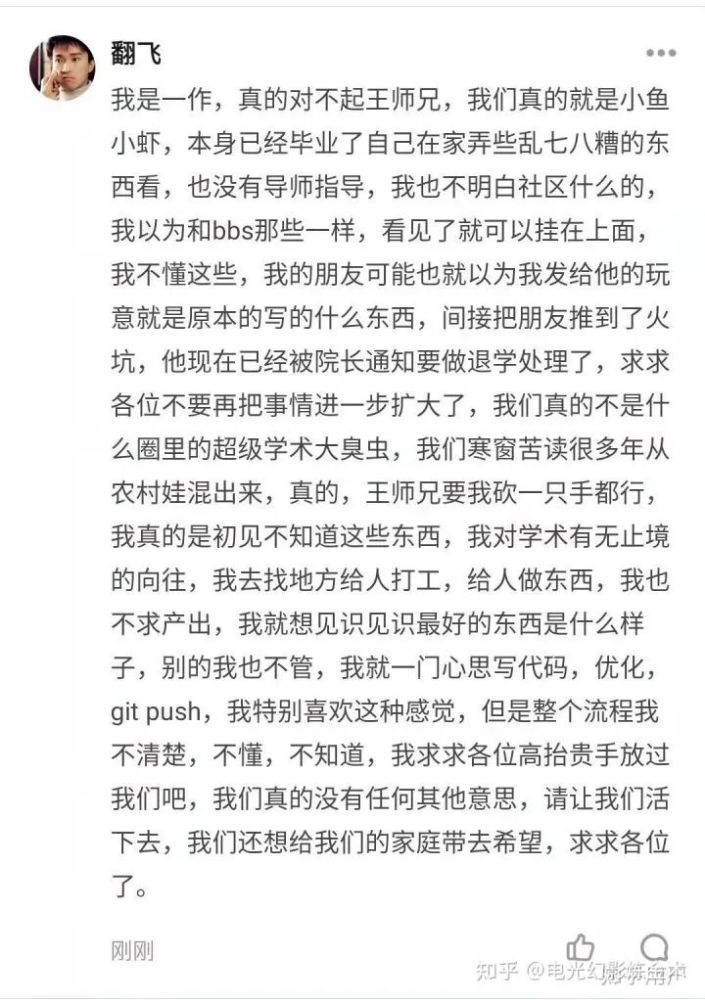 對于新手,如果說是一般性的錯誤甚至部分仿寫,都可以理解。但是全文照抄屬實說不過去,應(yīng)當(dāng)負(fù)有學(xué)術(shù)責(zé)任。何況這次是抄襲未發(fā)表未公開的文章??梢赃@么說,如果說王劍鋒沒有錘他的話,這篇文章的著作權(quán)將被他奪去,因為抄襲者是第一個公開的。這是非常惡劣的事件,研究者幾個月乃至幾年的工作,就被幾個小時的ctrl+c,ctrl+v奪取,傷害的不僅是王劍鋒本人,而且是其他認(rèn)真做research的人的感情。抄襲者應(yīng)當(dāng)公開承認(rèn)抄襲并道歉,而不是說“辦事不周“”不了解情況“”希望不要留下污點“。幸虧這次是抄襲到了知乎大V,有幾萬粉絲的王劍鋒,如果是抄襲的一般人,可能很難引起關(guān)注。