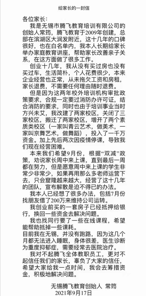 創(chuàng)始人發(fā)出求助信,表示人在無錫并未跑路,只是身體很差,希望大家給點(diǎn)時間,會去籌集資金解決問題。只是不知道家長們會如何選擇,學(xué)生無處上學(xué)學(xué)費(fèi)無法退回,但目前情況確實(shí)是這樣。