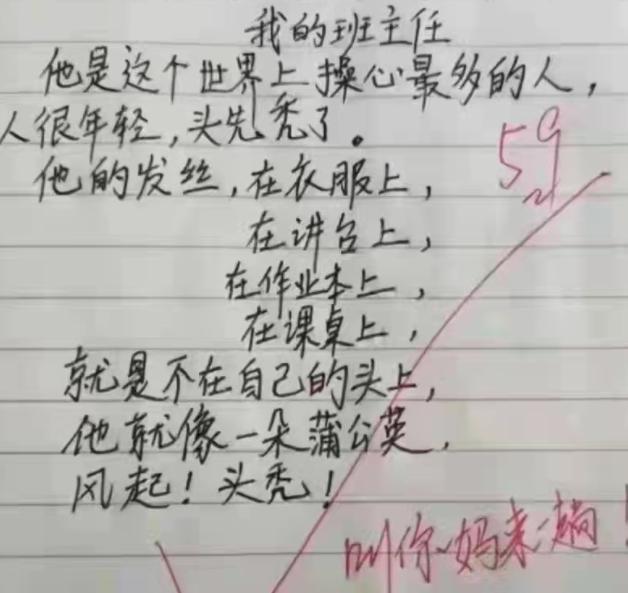 雖然小學(xué)生如此比喻會(huì)讓班主任覺得難為情,沒有面子,但通過(guò)這篇小作文,我們能夠感受到學(xué)生對(duì)班主任的愛和關(guān)注,他能觀察到老師的頭發(fā)日益減少,他們也能發(fā)現(xiàn)自己的作業(yè)本中夾雜了班主任的頭發(fā)。如此親密的師生關(guān)系,難道不令人羨慕嗎?