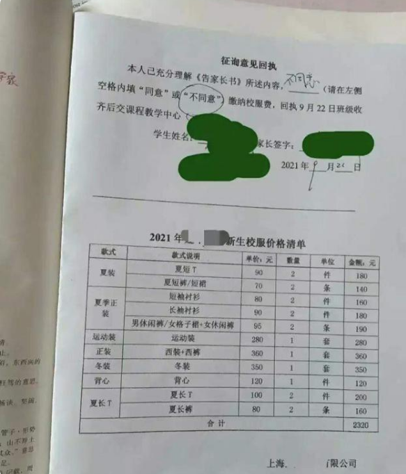 但是上海的一位家長(zhǎng),卻對(duì)學(xué)校訂購(gòu)校服的事情并不認(rèn)同,在孩子帶回來的告家長(zhǎng)書上直接簽上了“不同意”三個(gè)字,引發(fā)網(wǎng)友熱議。