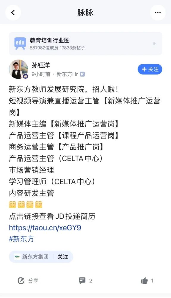 而在職場(chǎng)社交平臺(tái)“脈脈”上,一名認(rèn)證為“新東方HR”的員工在9月24日發(fā)帖,稱要招聘“短視頻導(dǎo)演兼直播運(yùn)營(yíng)主管”。