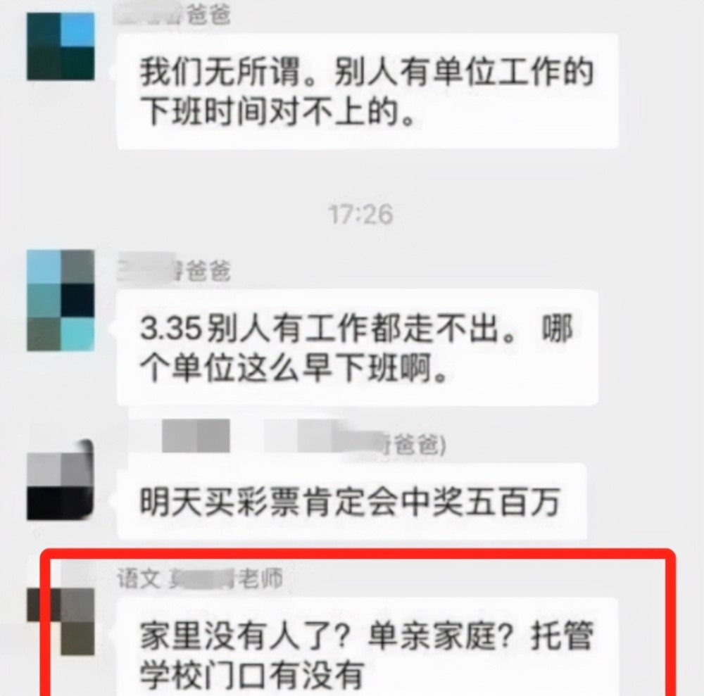班主任這樣的發(fā)言,也讓很多家長(zhǎng)明白了過來(lái),這就是變相勸退,不想讓孩子上課后延時(shí)班。有家長(zhǎng)表示自己來(lái)不及接孩子放學(xué),可能要參加課后延時(shí)服務(wù)。這個(gè)是侯老師開始出言諷刺:“你家沒人了?你單親家庭”?
