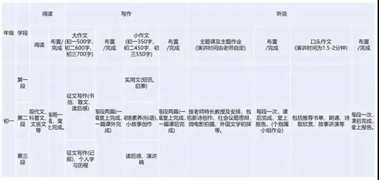 這是上海一個(gè)小學(xué)二年級(jí)學(xué)生的作業(yè)(見圖4),語(yǔ)文、英語(yǔ)、數(shù)學(xué)每一個(gè)都有好幾項(xiàng),我沒把作業(yè)全部列出來。大家能直觀地感受到我們二年級(jí)孩子的作業(yè)特別多。我這個(gè)學(xué)期和澳門老師一起做閱讀方面的研究。澳門老師發(fā)給我一份初中一年三個(gè)學(xué)段所有的中文科作業(yè)(見圖5)。一個(gè)學(xué)年的作業(yè)在這張表上就能列出來,按閱讀、寫作、聽說來進(jìn)行劃分。老師的自由度非常大。