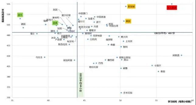 從圖6中大家可以看到,我們學(xué)生的成績(jī)最高,在右側(cè)最上角。同時(shí),我們的學(xué)習(xí)時(shí)間也是最長(zhǎng)的,尤其是在和芬蘭、日本這些與我們成績(jī)差異不太大的地區(qū)相比時(shí),你會(huì)發(fā)現(xiàn)我們確實(shí)學(xué)習(xí)效率較低。我們的學(xué)生每周學(xué)習(xí)時(shí)間為57個(gè)小時(shí),芬蘭的學(xué)生學(xué)習(xí)時(shí)間36個(gè)小時(shí),我們整整多了21個(gè)小時(shí)。有這21個(gè)小時(shí),我們的孩子可以做多少事情!為什么我們要把這些時(shí)間全部用在所謂的學(xué)習(xí)上?