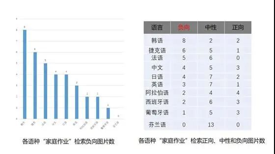 我按照?qǐng)D片的情緒負(fù)向、正向、中性來做了一個(gè)計(jì)數(shù)(見圖1)。發(fā)現(xiàn)韓國(guó)語(yǔ)檢索到的負(fù)向圖片有8張。芬蘭語(yǔ),沒有一張負(fù)向的圖片,也沒有一張正向圖片,只有中性圖片。所以芬蘭這個(gè)國(guó)家是不是特別值得研究?中文檢索的家庭作業(yè)圖片,出乎大家的意料,負(fù)向圖片也不多,正向圖片也有,中性圖片也有。做一個(gè)簡(jiǎn)單的統(tǒng)計(jì),可以看到,如果從社會(huì)輿論的角度來看,韓國(guó)的家庭作業(yè)問題更為突出。并且,東亞地區(qū)普遍負(fù)向評(píng)價(jià)較多。東亞國(guó)家的教育競(jìng)爭(zhēng)、社會(huì)的競(jìng)爭(zhēng)相對(duì)比較強(qiáng),所以造成這一問題的原因很可能是社會(huì)競(jìng)爭(zhēng)的傳遞。
