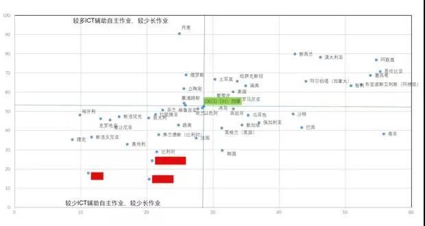 以O(shè)ECD的31個(gè)國(guó)家的均值畫一個(gè)十字線(見圖7),我們可以看到,上海、臺(tái)灣和日本是較少布置用信息技術(shù)輔助進(jìn)行的自主作業(yè)的,也很少布置長(zhǎng)作業(yè)。與很多發(fā)達(dá)國(guó)家相比,這種特征更加明顯。這與整體教育的關(guān)注度有非常大的聯(lián)系。當(dāng)然并不能據(jù)此詬病我們的老師故意不布置這樣的作業(yè)。