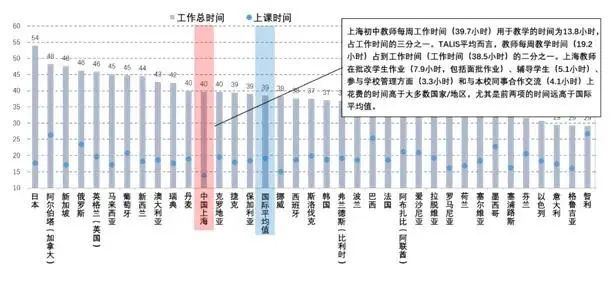 大家請(qǐng)看這幅圖(圖8),圖上描述的是世界上40多個(gè)國(guó)家(地區(qū))老師每周的工作時(shí)間以及用于上課的時(shí)間。大家會(huì)發(fā)現(xiàn),上海(粉紅底色)的老師工作時(shí)間處于平均水平。但上海老師的上課時(shí)間是全世界最短的,其實(shí)全國(guó)都是如此。老師的上課時(shí)間只占到其工作時(shí)間的1/3,但是全世界平均占到1/2。我們的老師把剩余的時(shí)間用來干什么呢?上海老師花費(fèi)較多的時(shí)間用來進(jìn)行備課、作業(yè)批改和教研活動(dòng)。