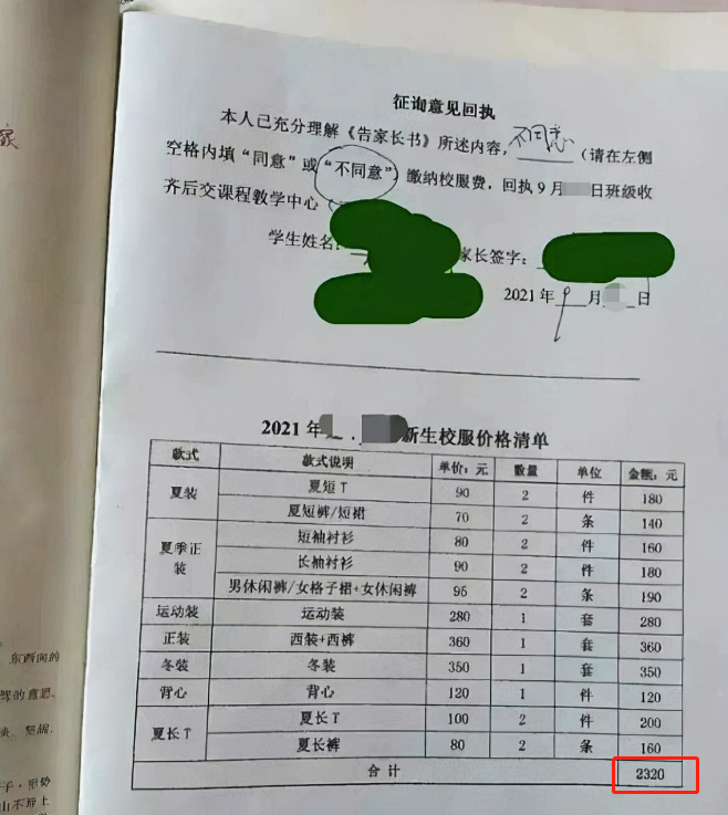 上海某?,F(xiàn)“天價(jià)校服”賬單,家長(zhǎng)直接簽不同意,網(wǎng)友:干得漂亮