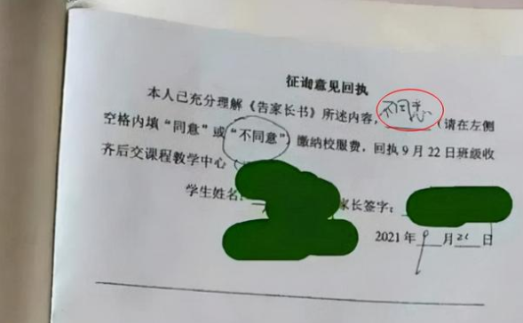 再看最后的總價,2320元,這個價錢對于普通小學(xué)來說確實是挺貴的,在正常家長的眼中,校服三五百元能接受,就算是達到1000元,為了讓學(xué)生在學(xué)校不被另眼相待,也能勉強同意,但是2320這個價格,確實讓家長有點接受不了,有一名家長直接在通知單中霸氣回復(fù)到“不同意”。