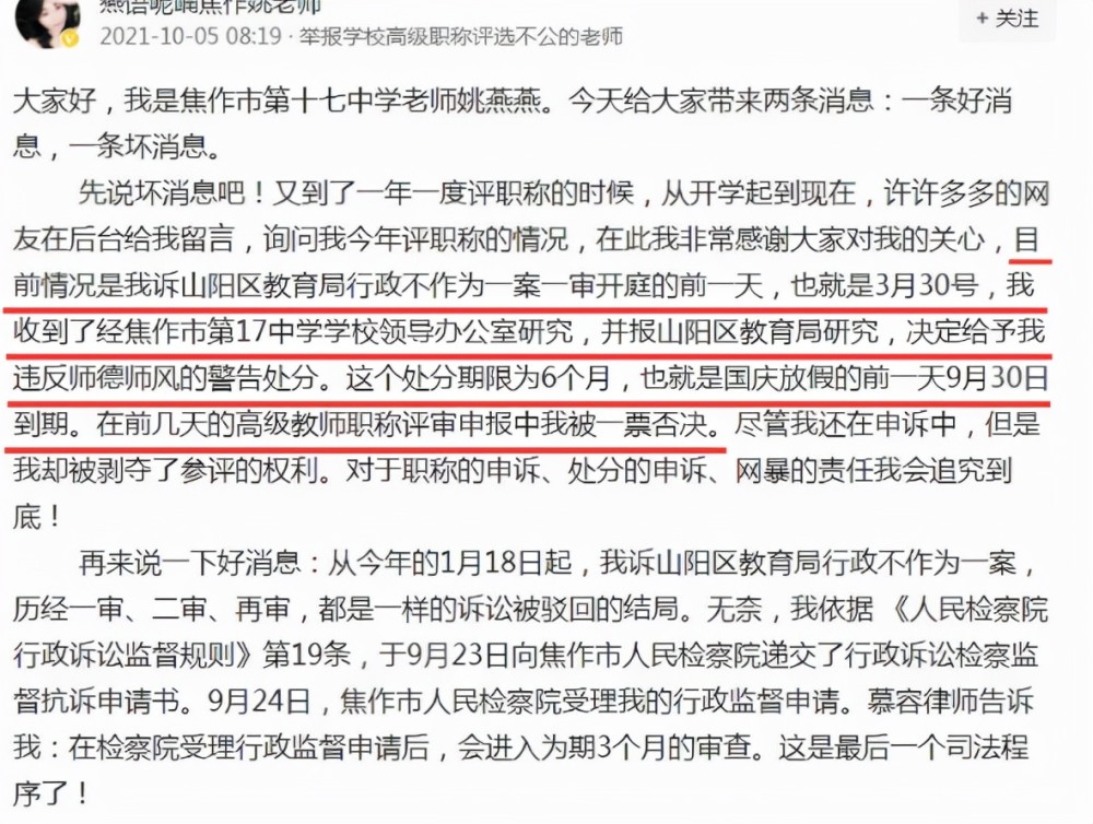 可是無(wú)法參加職稱評(píng)定,對(duì)于一位從業(yè)多年的教師而言是非常殘酷的,還因此被給予了違反師德師風(fēng)的處罰,相信任何一個(gè)老師都無(wú)法冷靜接受,這會(huì)影響到她日后的教學(xué)工作,也使得承受了很大的輿論壓力。