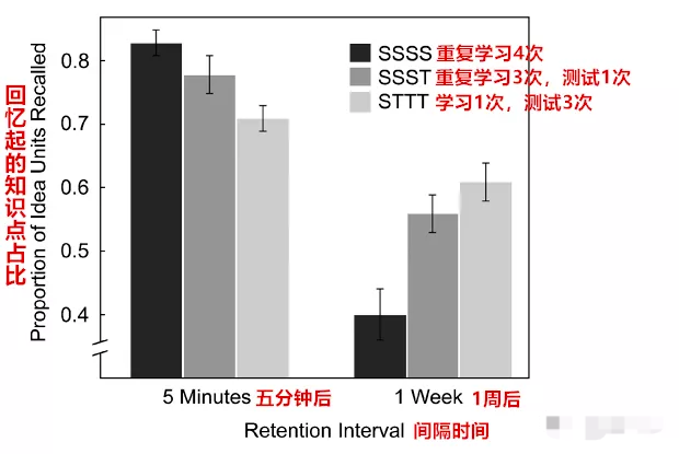 結(jié)果5分鐘后測(cè)試,記憶效果相差不多,“學(xué)習(xí)4次,不測(cè)試”的那組比“學(xué)習(xí)1次,測(cè)試3次”的那組還要稍高一點(diǎn);但一周后再測(cè)試,效果完全相反,“學(xué)習(xí)1次,測(cè)試3次”的那個(gè)組,能記住的知識(shí)點(diǎn)是“學(xué)習(xí)4次,不測(cè)試”那組的3倍左右!