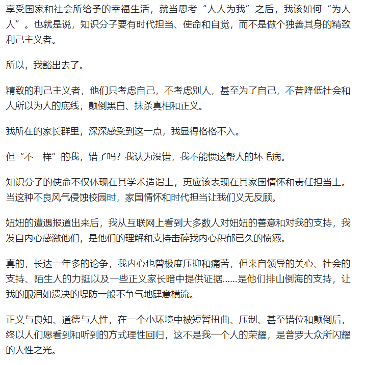 諸位朋友不妨想一想,是什么樣的壓力,迫使一位在公辦知名小學(xué)任教的老師,要靠辭職的方式,寧肯跑一個民辦學(xué)校去,來逃避帶“妞媽”孩子所在的班級?從現(xiàn)在翟老師的結(jié)果來看,辭職是正確的選擇。
