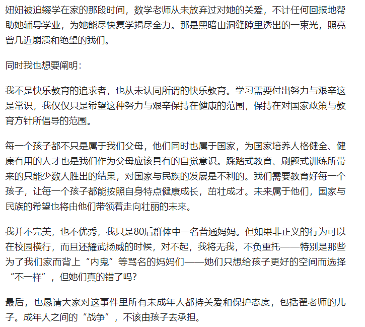 斥責(zé)班主任翟老師跟“雙減”政策作對的,罵學(xué)校的,罵37位家長自私自利的……被要求轉(zhuǎn)學(xué)的7歲孩子受傷了,她的媽媽,儼然是斗士,乃至于是中國教育的殉道者!