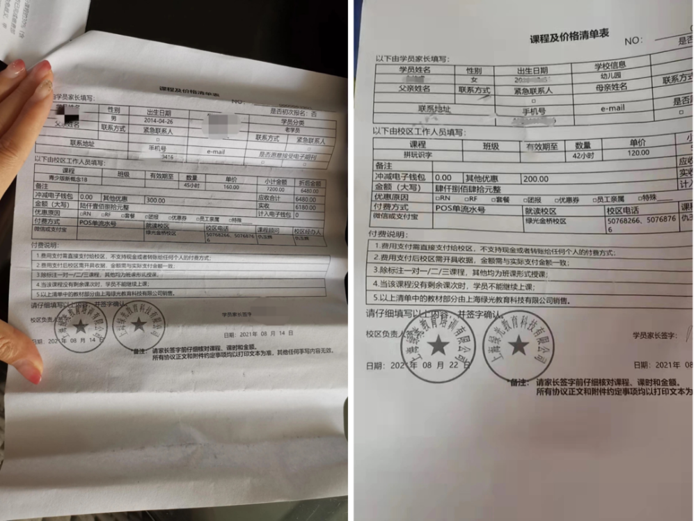 課程費用方面,綠光教育始終沒有執(zhí)行3個月一續(xù)費的收費政策,以該公司主推的“新概念課程”為例,綠光教育學(xué)員始終是以一本書(一般需要1-1.5年)或者一個學(xué)期的形式進(jìn)行續(xù)費繳費,其他學(xué)科類課程及素質(zhì)教育類課程也是如此。這也是此次綠光教育突然停業(yè)導(dǎo)致廣大家長損失巨大的一個重要因素。