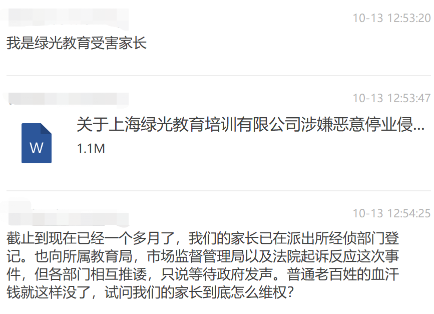 事發(fā)至今已一周有余,綠光教育學(xué)員家長已通過各種方式向國家有關(guān)部委及本市有關(guān)部門反映情況,希望本市相關(guān)機(jī)構(gòu)及普陀區(qū)職能機(jī)構(gòu),本著“為群眾辦實事”、“為百姓解難題”的宗旨盡快介入本次事件,我們相信相關(guān)機(jī)構(gòu)及職能部門一定會本著公正的原則厘清線索,查清事實,還百姓一個公平公正,還社會一個清風(fēng)正氣。
