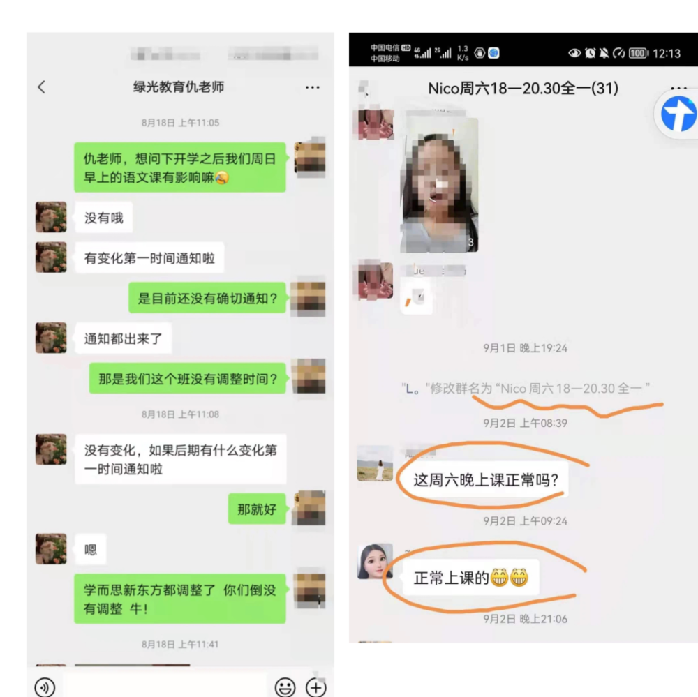 直至9月2日綠光教育停業(yè)公告的前一天,仍有工作人員利用自己是教育局白名單企業(yè)鼓動家長續(xù)報課程。我們中很大一部分家長在6-8月(雙減政策出臺后)在綠光工作人員的指導(dǎo)下進(jìn)行了大額續(xù)費,但并未享受到對應(yīng)課程服務(wù)。同時為規(guī)避國家“雙減政策”,綠光教育銷售人員表示可以實現(xiàn)“周中上新課,周末托管”的形式開展課程,所購買的課程服務(wù)不會受到影響;期間家長通過面談、電話、微信等方式詢問校區(qū)校長與銷售人員,相關(guān)人員對于課程服務(wù)始終表示雖然綠光教育會調(diào)整上課時間,但課程會繼續(xù),換而言之繼續(xù)上課沒有問題。