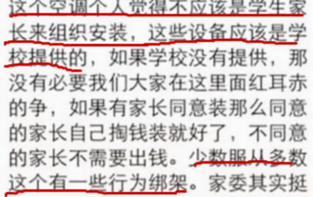 不少家長(zhǎng)對(duì)此表示反對(duì),為了讓學(xué)生有更好的學(xué)習(xí)環(huán)境而購(gòu)置的硬件設(shè)施,這不是應(yīng)該學(xué)?;ㄥX(qián)嗎?為啥要讓家長(zhǎng)自己掏錢(qián)?家長(zhǎng)自費(fèi)購(gòu)買(mǎi)空調(diào)后,是不是學(xué)校的電費(fèi)家長(zhǎng)還要支付?沒(méi)想到家委會(huì)不僅沒(méi)有把意見(jiàn)反饋給學(xué)校,反而開(kāi)始做家長(zhǎng)的工作,這位家一氣之下將學(xué)校和家委會(huì)都實(shí)名舉報(bào)給相關(guān)部門(mén)。