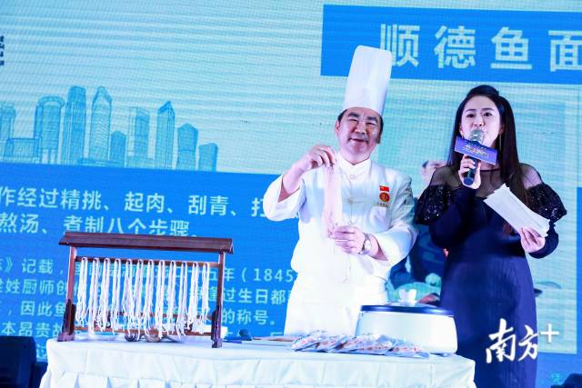 原來,據(jù)《順德縣志》記載,魚面是清道光二十五年,大良清暉園一位廚師創(chuàng)作的。在順德,每逢過生日都要做魚面,代表長(zhǎng)壽年年,因此魚面也有“長(zhǎng)壽魚面”的稱號(hào)?!皝硎澜缑朗持柬樀掠瓮?,除了吃魚生,還要吃漁面,這才算真正到順德?!绷哄\輝一邊用竹筒秀出魚面制作技藝,一邊還不忘向駐足觀看的貴陽市民們推薦順德。