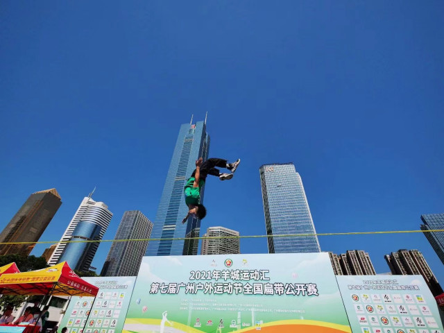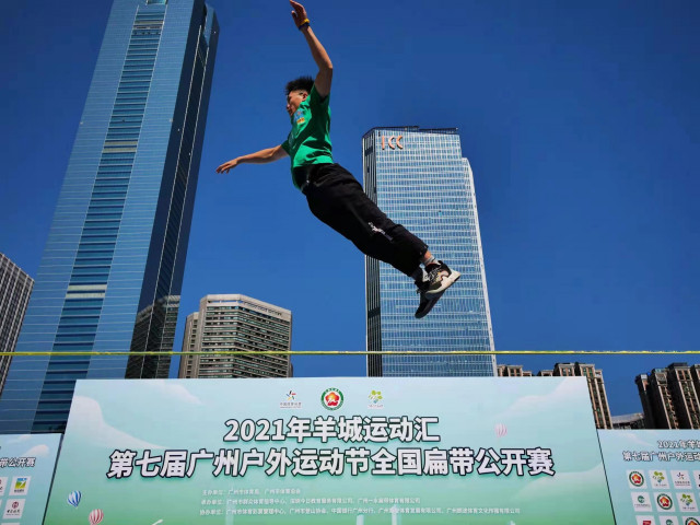 11月13日,2021年羊城運動匯·第七屆廣州戶外運動節(jié)全國扁帶公開賽在廣州天河體育中心田徑副場火熱舉行。來自各地的扁帶高手齊聚天體,展開激烈爭奪,為市民呈現(xiàn)了一場精彩絕倫的“空中技巧”表演。