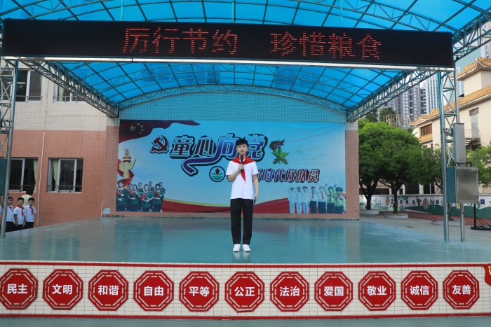 隨后,教務(wù)處趙郭皓副主任帶領(lǐng)全校師生齊誦“惜食節(jié)儉”的古詩詞名句,感受和傳承中華節(jié)儉美德。簡短的誦讀中,大家深深感悟到:當(dāng)今時(shí)代人們雖然不再缺衣少食,但土地能承載和產(chǎn)出的資源始終有限,“厲行節(jié)約、反對(duì)浪費(fèi)”的傳統(tǒng)不能忘、不能丟。最后林小舟校長向每個(gè)班級(jí)代表頒發(fā)了“珍惜糧食,粒粒辛苦”的宣傳海報(bào),倡議全體少先隊(duì)員從小事做起,從自己做起,從點(diǎn)滴做起,節(jié)約每一粒米,共同養(yǎng)成勤儉節(jié)約好習(xí)慣。